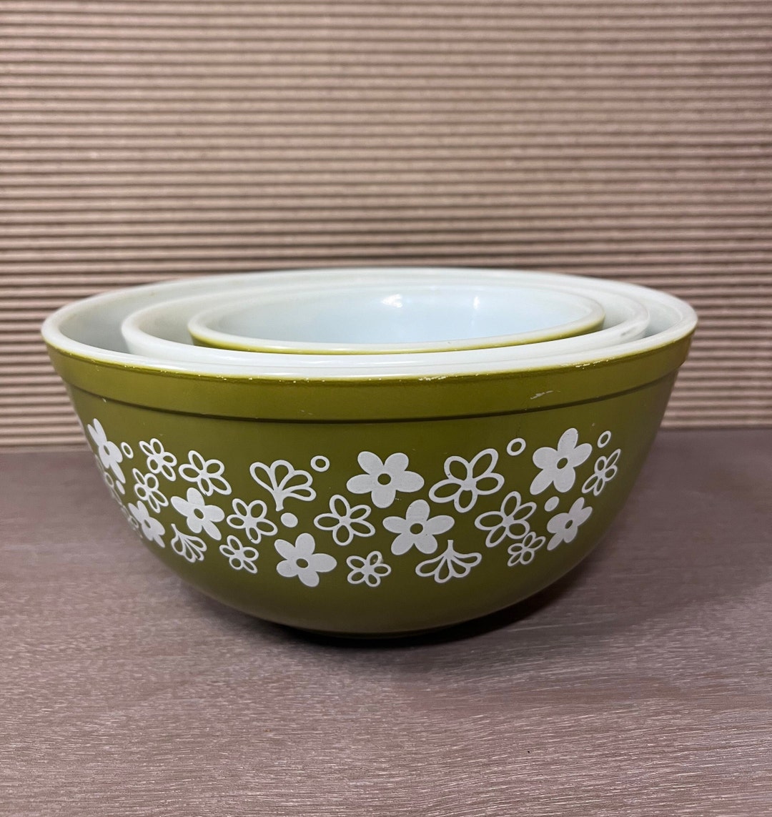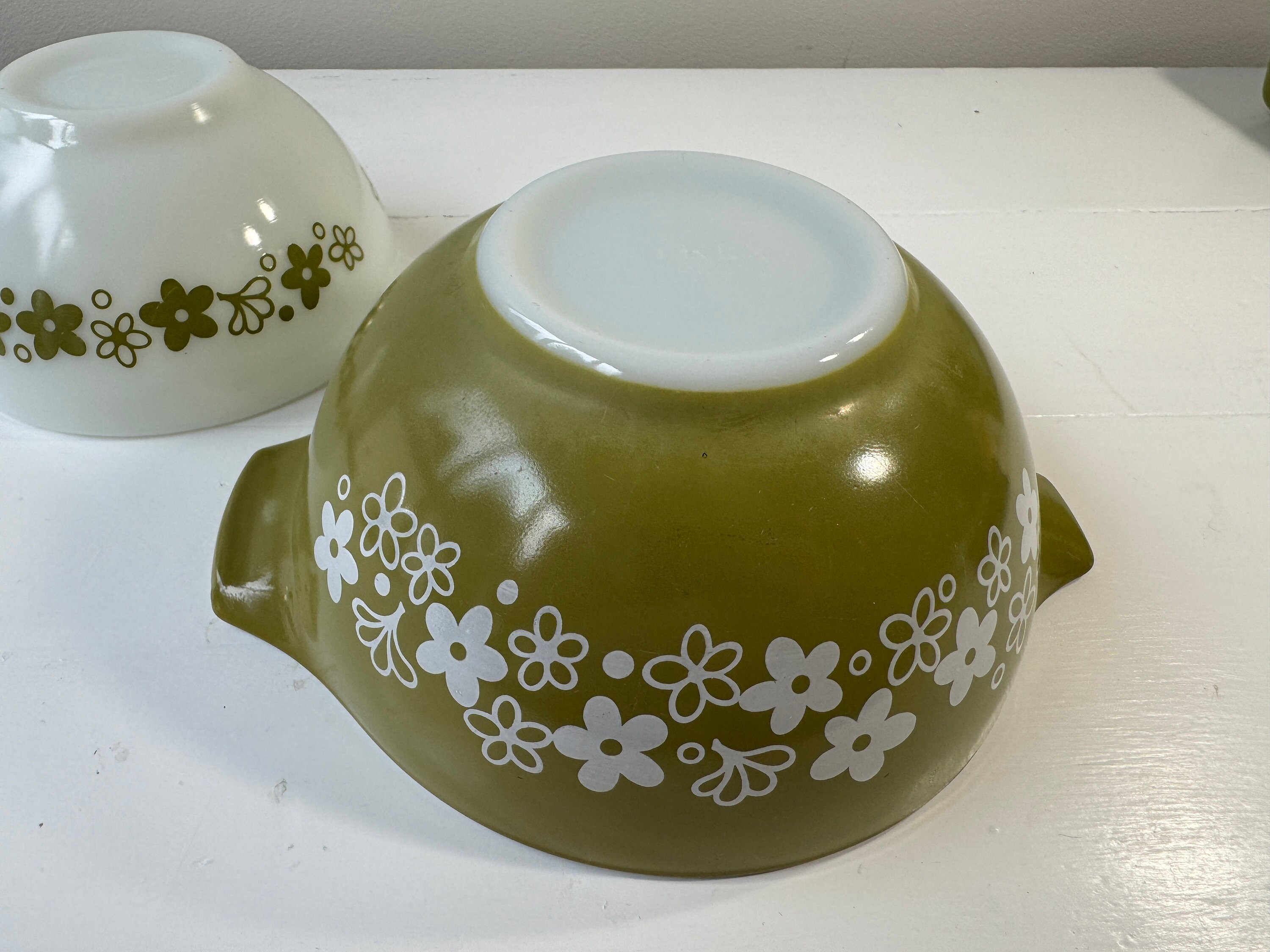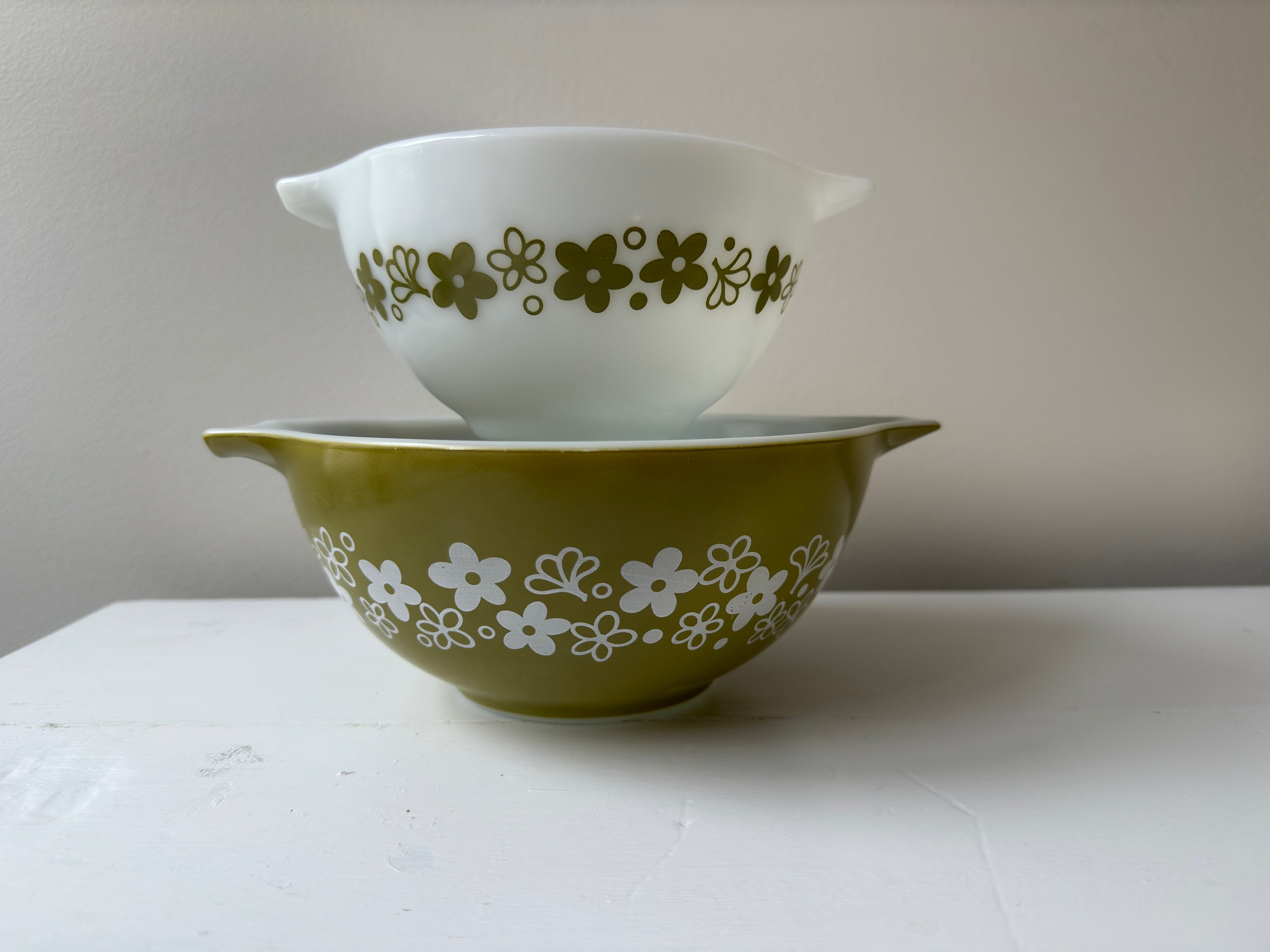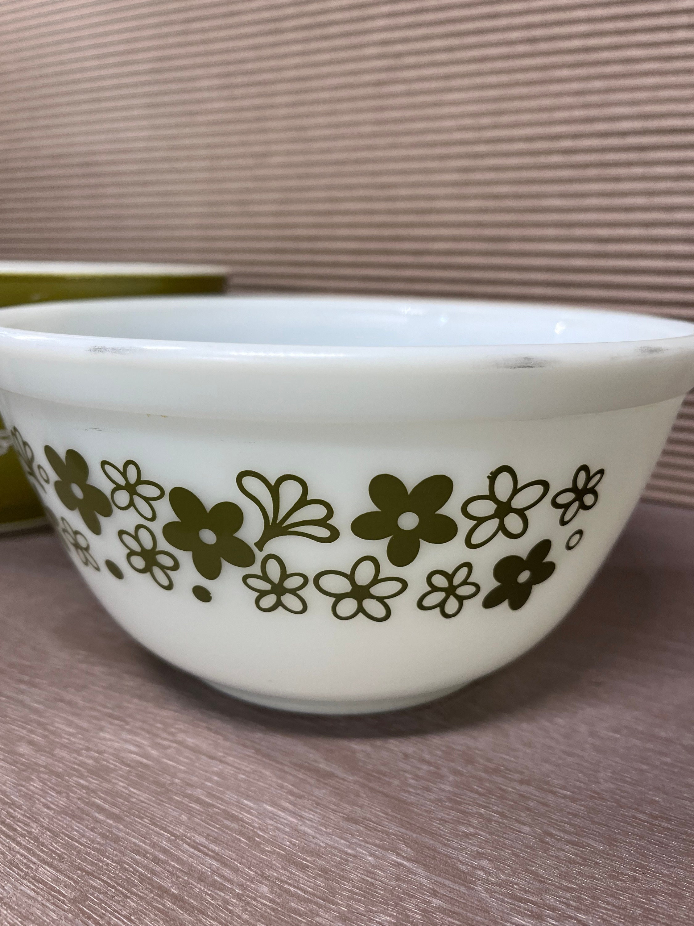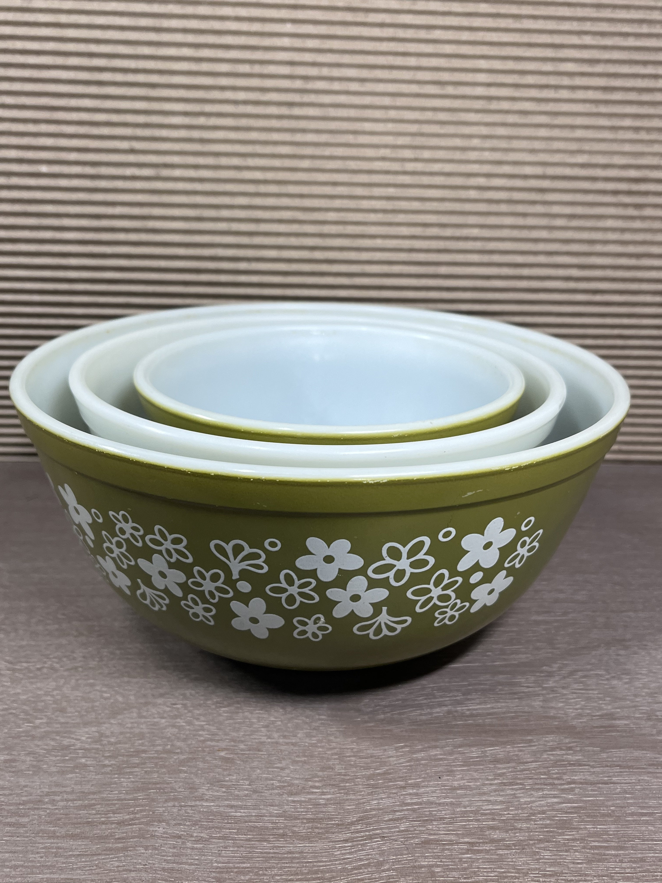 Pyrex 4pc spring blossom green cinderella bowl set (1972-1978) spring. Pyrex spring blossom 1972 nesting bowl set. Pyrex spring blossom, new in box, spring blossom green, vintage. Pyrex spring blossom 1972 nesting bowl set. Pyrex-mixing bowls-spring blossom green 1972