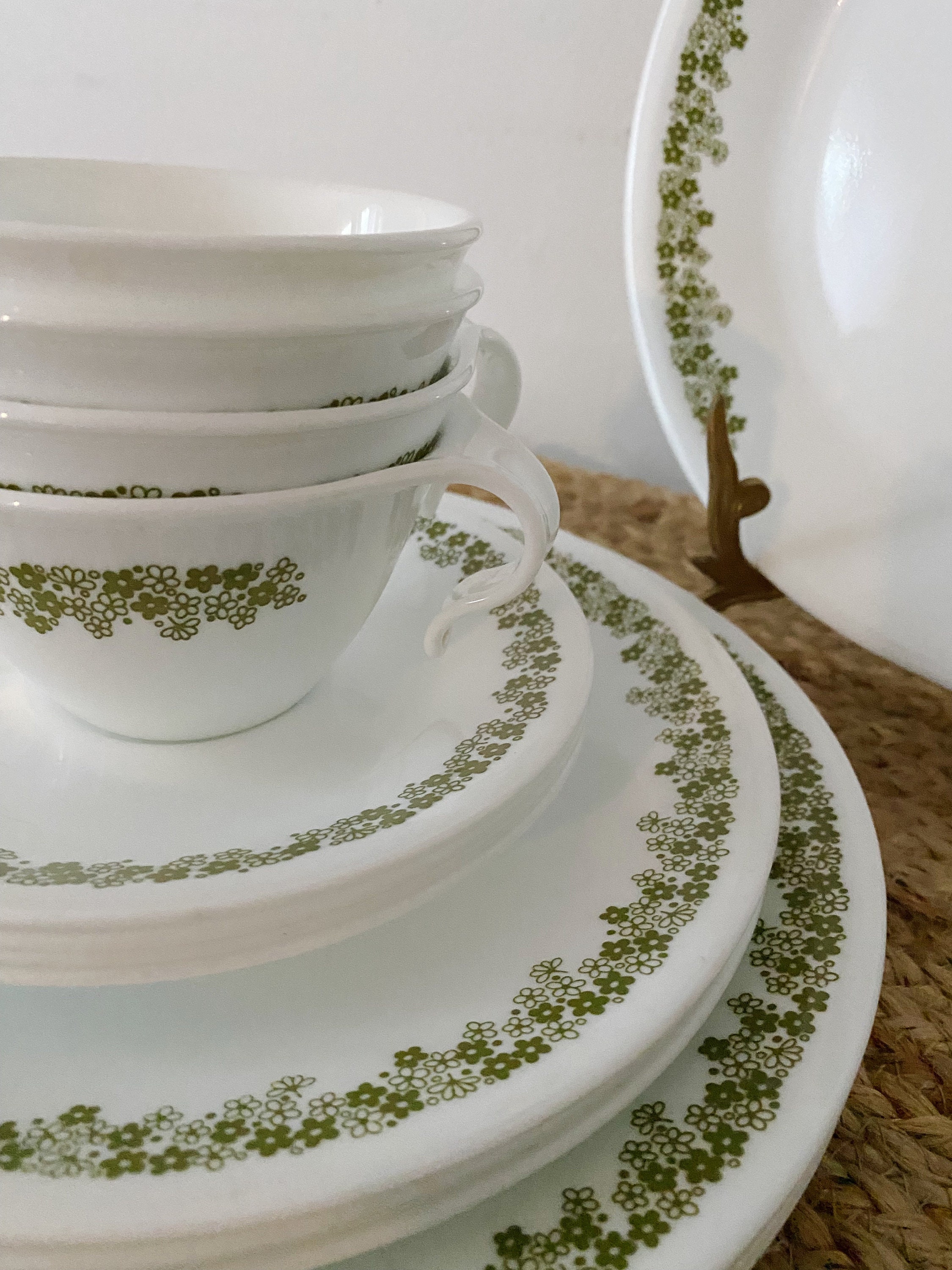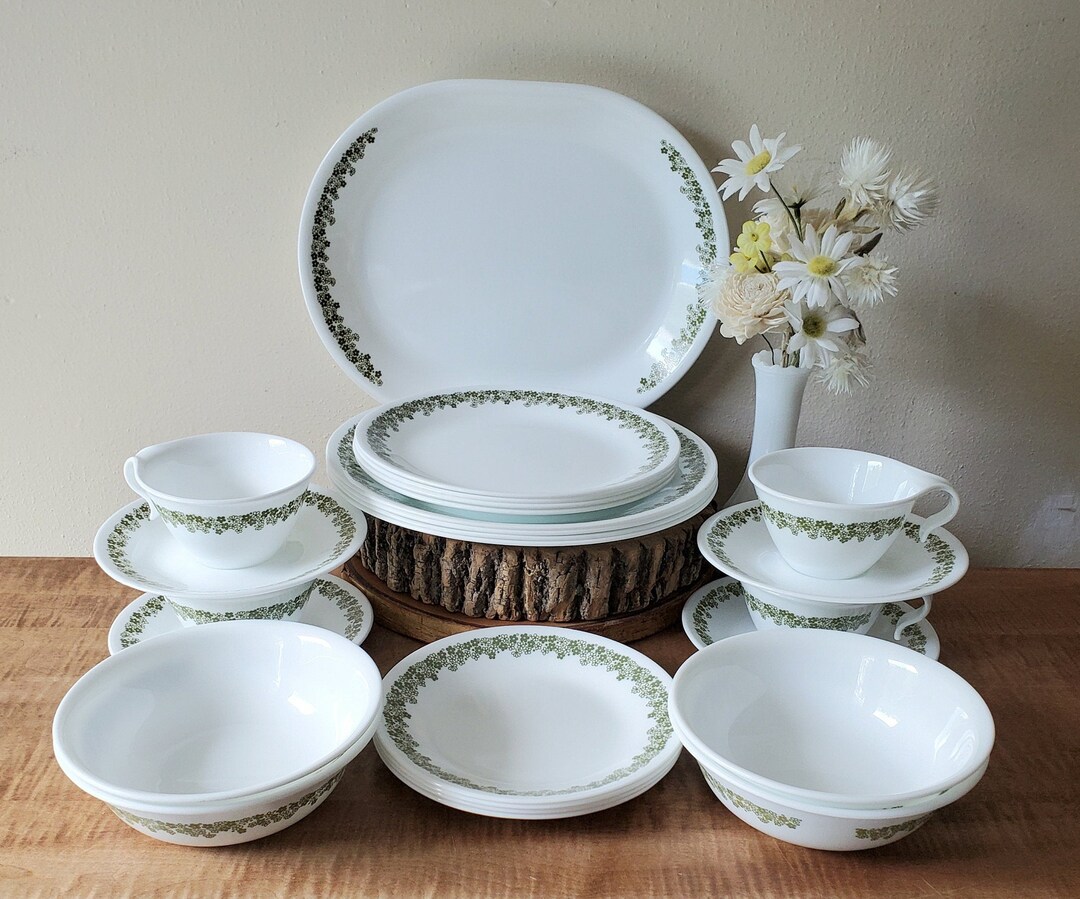 Vintage corelle spring blossom dinnerware green & white floral. Vintage corelle spring blossom dishes, crazy daisy dinnerware, 25. Vintage corelle spring blossom dinnerware set of 17 pieces. Vintage corelle spring blossom crazy daisy dishes for four. Corelle dinnerware